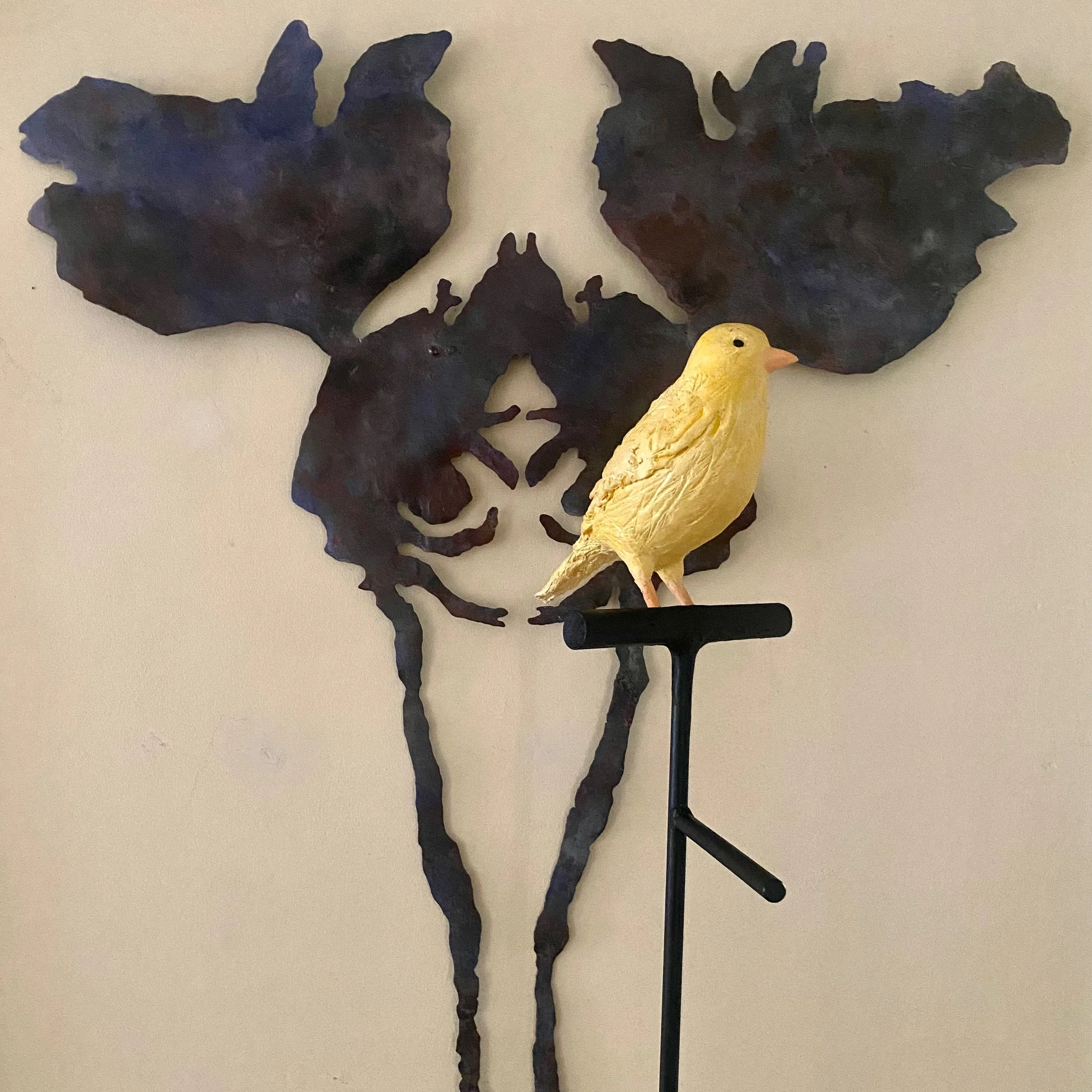 In her Mercury 20 exhibition, “Grounded”, Hopi Breton considers themes of place, displacement, and spiritual well-being connected to land and home, amid heightened emotions of anxiety, loss, and fear exacerbated by global issues of war and climate change. A tortoise signifies longevity, while candles evoke memory and reverence. A blanket crafted from rock offers a sense of rooted security, contrasting with the precariousness and anxiety symbolized by a boulder atop a ladder. Hopi Breton is an artist that creates sculpture that are hybrids of figurative elements, inanimate objects, animals, and combinations of mixed media. Her work leans on ecology and language/literature as guides, and she finds poetic connections in the combination of materials and forms to spark new meanings and metaphors. Materials such as iron, gold, and salt, as well as forms such as birds and rocks are used for symbolism as much as for their formal qualities.